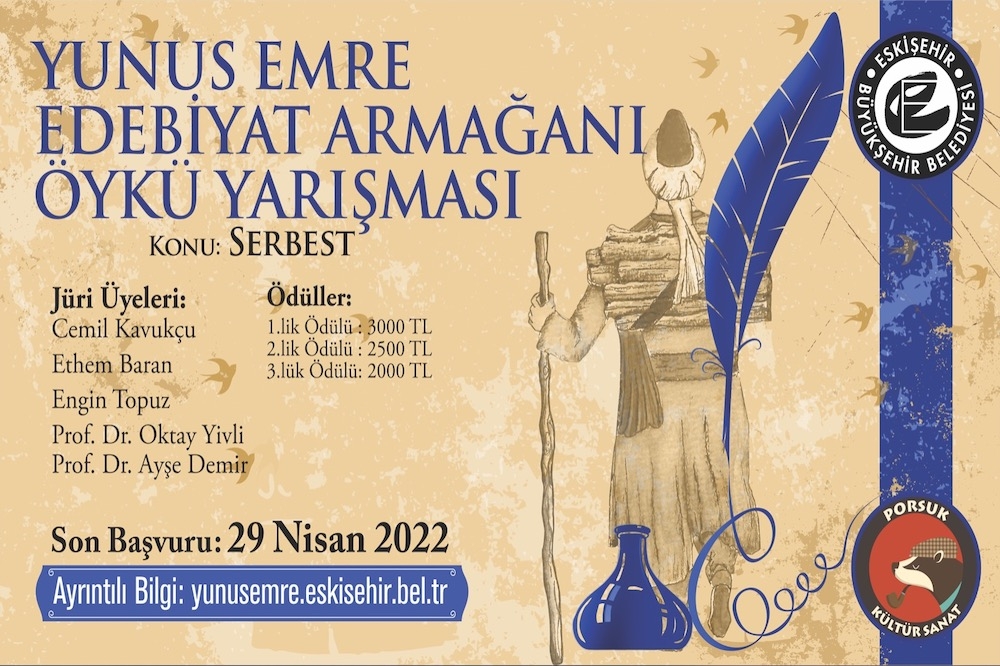 Halk şairimiz Yunus Emre’nin anısını ve adını yaşatmak için düzenlenen Yunus Emre Edebiyat Armağanı Öykü Yarışması başvuruları başladı. 29 Nisan 2022 tarihine kadar yapılan başvuruların değerlendirileceği Yunus Emre Edebiyat Armağanı Öykü Yarışması’nın konusu bu yıl da serbest olarak belirlendi. Yarışmaya katılmak isteyenler edebiyatarmagani@eskisehir.bel.tr mail adresine e-posta göndererek başvurularını yapabiliyorlar. Yunus Emre Edebiyat Armağanı Öykü Yarışması’nda sonuçların 22 Mayıs’ta açıklanacağını belirten yetkililer, yarışma birincisinin 3 bin TL, ikincisinin 2 bin 500 TL, üçüncüsünün 2 bin TL kazanacağını ifade ettiler. Başvurular alanında uzman jüri üyeleri Cemil Kavukçu, Ethem Baran, Engin Topuz, Prof. Dr. Oktay Yivli ve Prof. Dr. Ayşe Demir tarafından değerlendirilecek. Yarışmaya katılan hikâyelerden dereceye giren öykülerle birlikte yayınlanmaya değer görülen yedi öykünün daha yer alacağı kitap basılarak edebiyatseverlerle buluşacak.